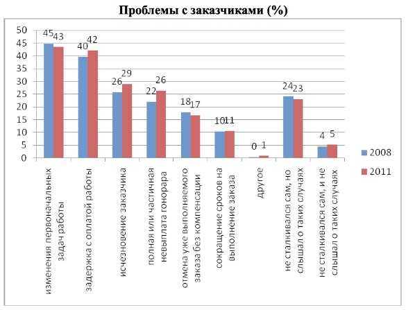 С 2008 г. по 2011 г. профессиональная структура удаленной работы изменилась: существенно выросла доля занимающихся работой с текстами, а также доля занятых маркетингом и инжинирингом, и немного снизилась доля фрилансеров, занятых разработкой и поддержкой сайтов, графикой и дизайном.