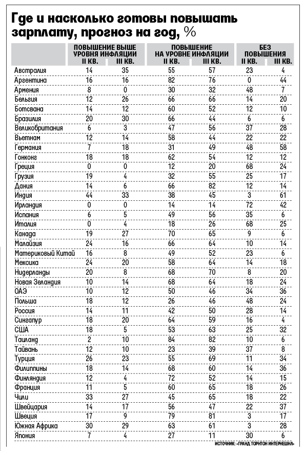 В ближайшие 12 месяцев индексировать зарплату на уровне инфляции собираются 50% российских работодателей, выяснили аналитики Grant Thornton International, опросив в III квартале 100 российских работодателей из Москвы, Петербурга, Нижнего Новгорода, Новосибирска и Екатеринбурга. Если сравнивать с другими странами (исследование охватило 2700 компаний в 39 странах мира), то этот показатель выше в Таиланде и Дании (82%), Швеции (81%), а также Аргентине (76%) и Нидерландах (70%). Надо при этом отметить, что количество российских компаний, высказавших готовность проиндексировать оклады подчиненных в связи с инфляцией, выросло: по сравнению со II кварталом (компания проводит опрос каждые три месяца) – на 8%. Зато тех, кто захотел повысить зарплаты сотрудников выше уровня инфляции, стало меньше: во II квартале это планировали сделать 14% российских работодателей, а в третьем – уже 11%.