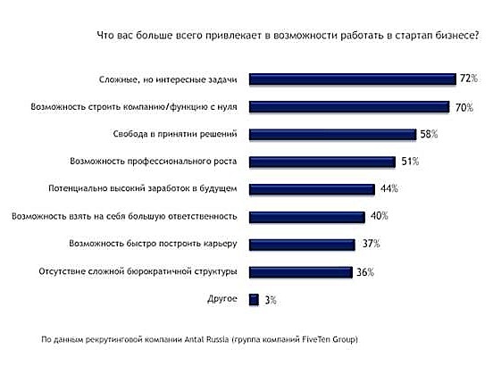 89% менеджеров среднего и высшего звена в России и СНГ готовы принять предложение о работе в стартап-проектах, утверждают специалисты рекрутинговой компании Antal Russia, опросив 360 менеджеров среднего и высшего звена. "Работа в стартапе – это хорошая возможность построить свою карьеру", - прокомментировал свой ответ один из респондентов. «Начинать проект с нуля - всегда интересно. Чувствуешь себя пионером, первооткрывателем. При этом очень важно, чтобы руководство не давило, не запирало в рамки, не подрезало крыльев, а давало свободу творчества", - отмечает другой опрошенный. "В России стартапы слишком нестабильны", - скептичен третий.