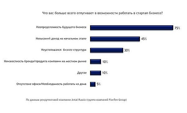 По данным Antal, главными аргументами против работы в стартап-компаниях являются неопределенность будущего бизнеса (так считают 75% респондентов), невысокий доход на начальном этапе (45%) и неустоявшаяся бизнес-структура (30%). Кроме того, респонденты опасаются недостаточной известности компании и продукта на рынке и необходимости работать из дома в некоторых случаях. При этом изменить скептическое отношение к работе в стартапах в основном могут значительное повышение дохода при переходе, интересная и перспективная бизнес-идея, личность основателя или руководителя.