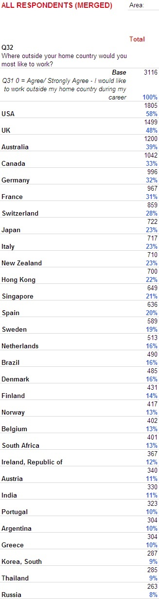 Всего же пожелало работать за рубежом 71% респондентов, причем больше всего желающих покинуть родные пенаты в Африке (93%), а также в Центральной и Южной Америке (81%). Реже прочих хотели бы работать за рубежом представители азиатских стран, США, Канады и стран Карибского бассейна (69%).