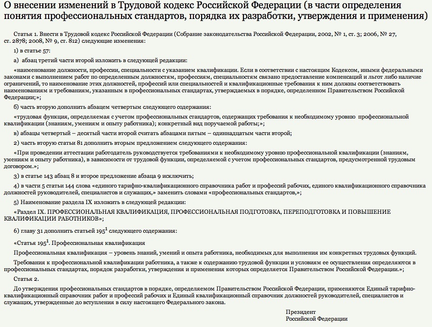 К концу марта правительство внесет законопроект в Госудуму. Сафонов пояснил, что единый квалификационный справочник опирался на практику советских времен, его положения не учитывали многих параметров и не позволяли оценивать и развивать потенциал работника.