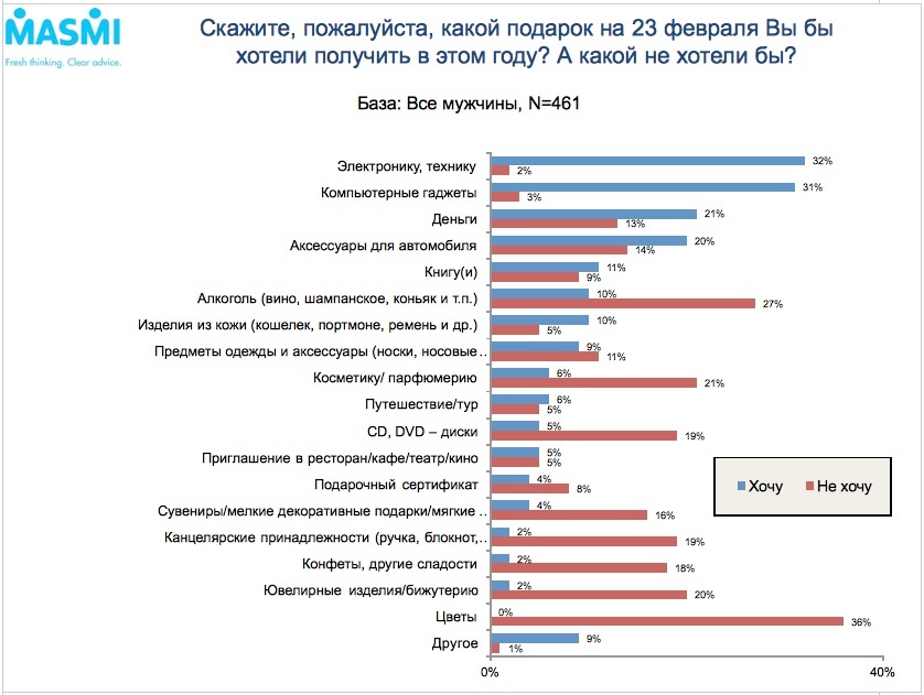 Судя по опросу полутысячи мужчин, представители сильного пола меньше всего хотят получить на 23 февраля в подарок цветы, алкоголь, косметику и парфюмерию, при этом мечтают об электронике, компьютерных гаджетах, деньгах и автомобильных аксессуарах (см. диаграмму).