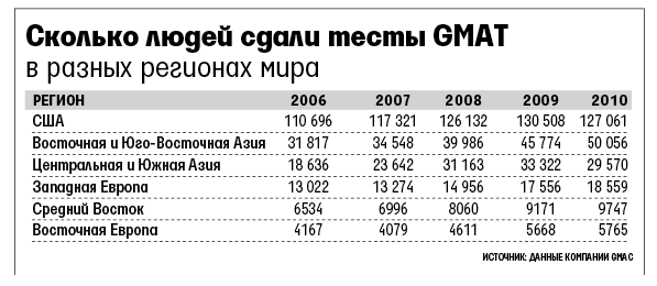 Всего за последние пять лет, с 2006 г., число сдавших GMAT россиян выросло на 64%. По динамике роста сданных тестов наша страна вошла в тройку лидеров. В целом в Европе спрос на бизнес-обучение после кризиса также сильно вырос (см. таблицу), но главным образом за счет немцев и итальянцев, в остальных странах он находится на том же уровне, а в двух даже упал. GMAC анализирует цифры по всему миру с опозданием почти на год – данные за 2011 г. будут в конце этого года. По предварительной информации, за прошлый год сдали тест 18 698 жителей Западной Европы, год назад их было 18 559, в 2006 г. – 13 022 человека. Что, в принципе, отражает тенденцию роста желающих поучиться в бизнес-школе в периоды кризиса и нестабильности на рынке труда, отмечают аналитики GMAC в своем докладе.