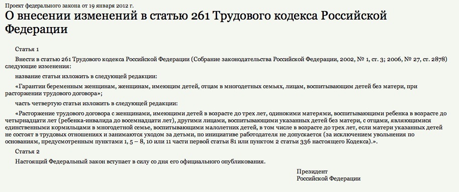 Все началось в ноябре прошлого года, когда Алексей Остаев, бывший сотрудник компании «Логос-медиа» и отец троих детей (двух, семи и 12 лет, один из которых инвалид) пожаловался в Конституционный суд на гендерные перекосы российского трудового законодательства: по его мнению, закон в нынешнем его виде нарушает права работающих отцов. Конституционный суд 15 декабря 2011 г. официально признал положение ч. 4 ст. 261 Трудового кодекса противоречащим Конституции. Проект соответствующего федерального закона был одобрен Российской трехсторонней комиссией, включающей представителей работодателей, профсоюзов и правительства.