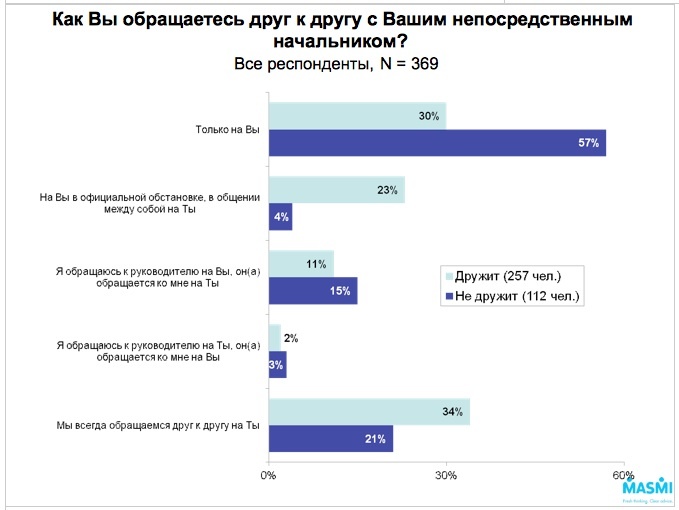 Обращение на «ты» или на «вы» фактически не является явным маркером наличия или отсутствия дружеских отношений на работе, считают исследователи. Респонденты-подчиненные, охарактеризовавшие свои отношения с начальством как дружеские, все-таки несколько чаще обращаются друг другу на «ты» (34%), хотя значительная доля сохраняет обращение на «вы» (30%), 11% обращается к руководству на «вы», в то время как начальство к ним на «ты».