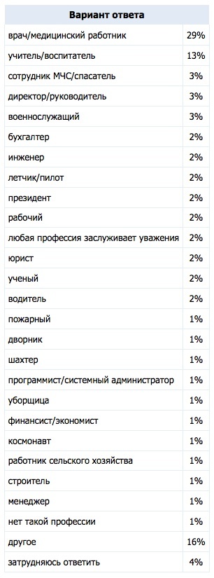 Судя по ответам, самыми уважаемыми признаны профессии врача и учителя, которые назвали 29 и 13% респондентов соответственно. По 3% голосов набрали спасатели МЧС, руководители и военнослужащие. По 1% - профессии космонавта, шахтера, строителя, дворника, уборщицы, финансиста и программиста (подробнее см. таблицу).