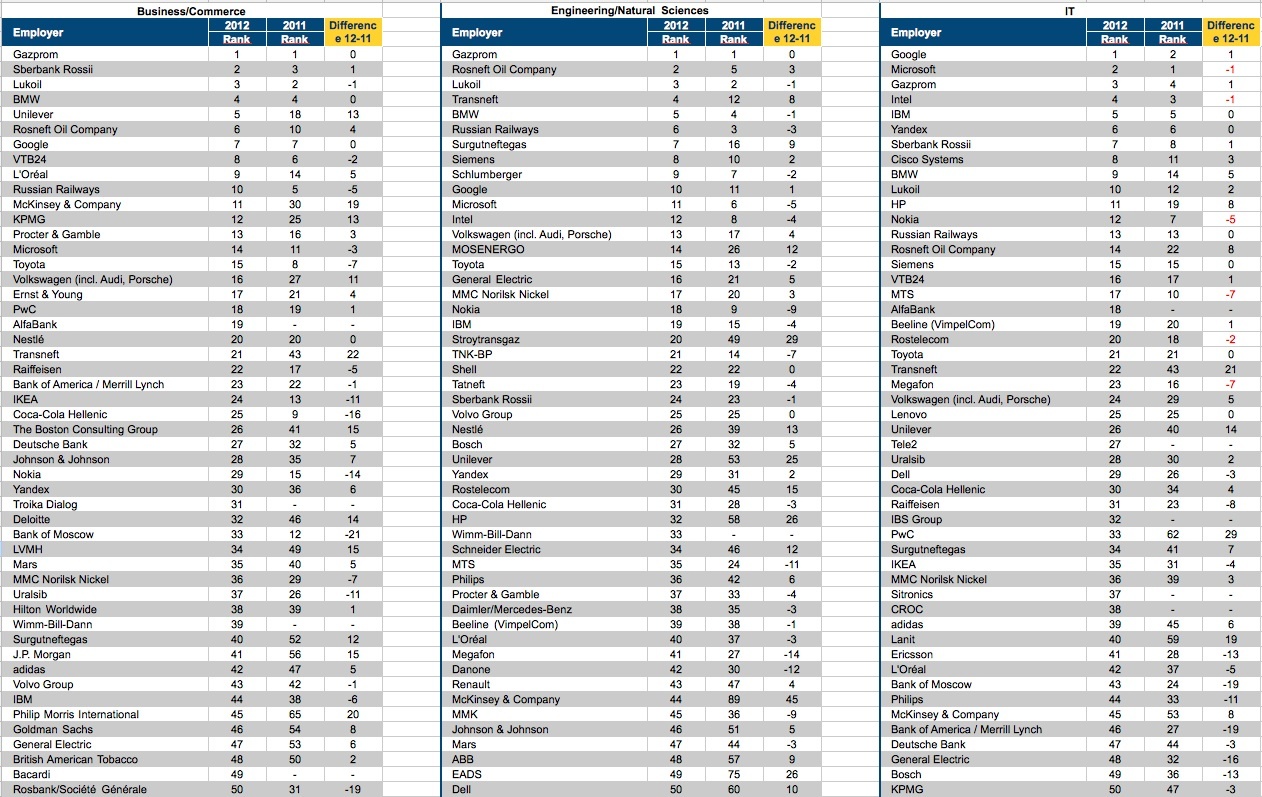 Иностранные компании занимают более половины позиций ренкинга топ-50 наиболее привлекательных российских работодателей 2012 г. по версии международной исследовательской компании Universum. Результаты исследования были получены в этом году на основе анализа более 24 500 оценок свыше 8000 студентов 61 российского вуза.