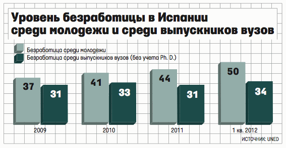 Только за I квартал 2012 г. испанский рынок труда потерял 2,7% рабочих мест по сравнению с IV кварталом 2011 г., рассказал Лабеага. Получается, что рабочие места для выпускников вузов не создаются, опытные сотрудники теряют работу, что еще больше увеличивает конкуренцию на рынке труда. Качество образования тут ни при чем: тысячи испанских инженеров ищут и находят работу в Германии, других европейских и латиноамериканских странах.