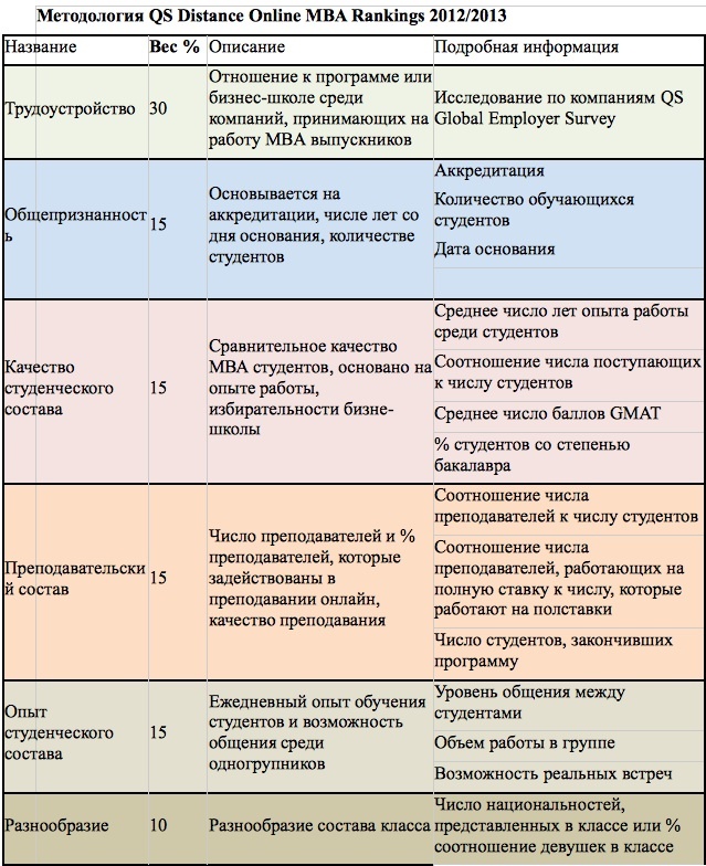 Методология составления ренкинга QS Distance Online MBA Ranking 2012/13