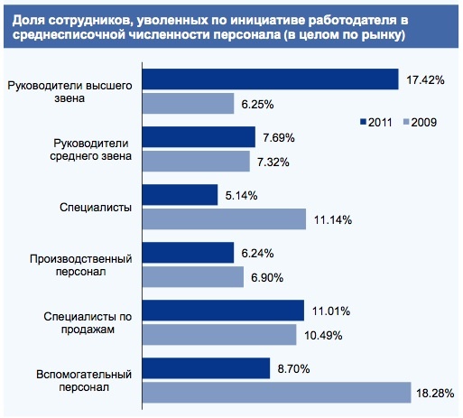 Судя по данным исследования, за первый (2009 г.) год кризиса в рассматриваемых компаниях уволили 17,42% всех руководителей высшего звена, тогда как в 2011 г. доля уволенных топ-менеджеров составила лишь 6,25%. Доля рядовых специалистов, уволенных по инициативе работодателя в кризис, составила 11,14%, тогда как в 2011 году - лишь 5,14%.