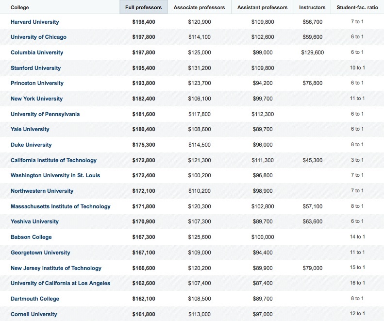 Из доклада AAUP, опубликованного в Chronicle of Higher Education, следует, что лидером рэнкинга стал Гарвард, где средний доход профессора, работающего на полную ставку, составил $198 400. На втором месте - Чикагский университет и Университет Колумбии (по $197 800). На третьем - Стэнфорд с окладами в $195 400. На четвертом - Принстон ($193 800). Замыкает пятерку Нью-Йоркский университет со средним доходом за девять месяцев учебного года в $182 400. Подробнее смотрите таблицу.