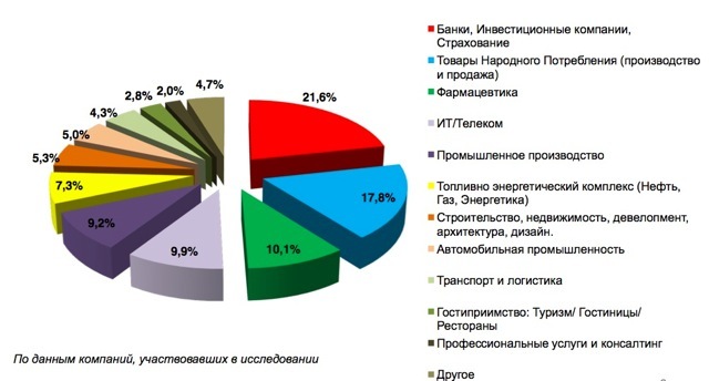 Пятую часть (21,6%) суммарной выручки рекрутинговых компаний в 2011 г. составили сделки в финансовом секторе. На втором месте по активности на рынке рекрутмента - компании FMCG (17,8% рынка). На третьем месте - фармацевтические компании, сделки с которыми принесли 10,1% общей выручки (подробнее смотрите диаграмму).