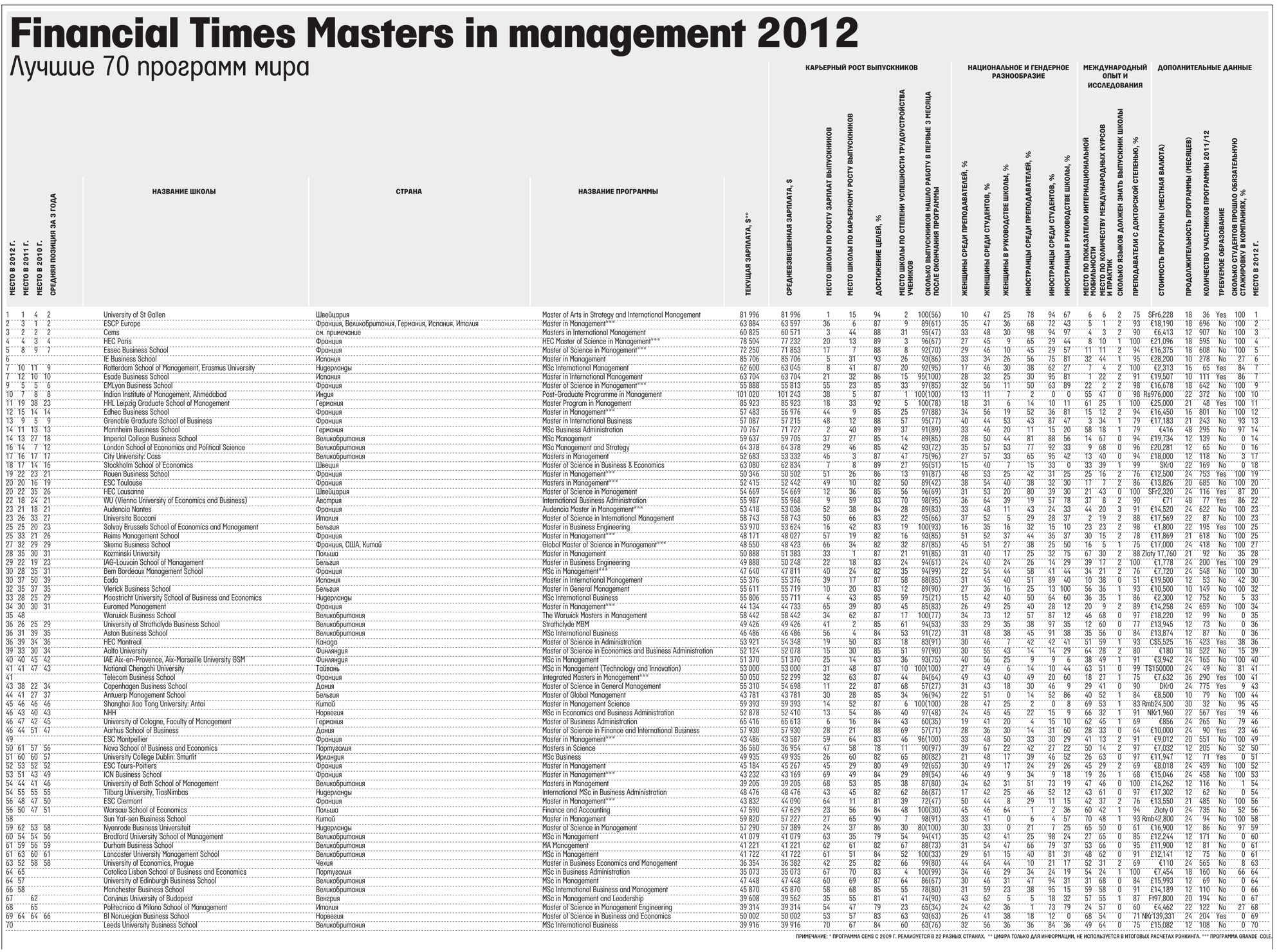 Рейтинг магистерских программ по менеджменту (MiM), ежегодно составляемый FT уже восьмой раз, остается европейским проектом – его возглавляет швейцарская школа, а участники в основном французские и британские конкуренты. Рейтинг основан на опросе бизнес-школ и их выпускников 2009 г. (подробнее о критериях см. врез на стр. 14).