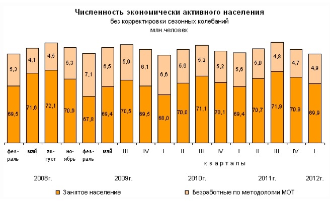 Динамика занятых и безработных в России 2008 -2012 гг. (Росстат)