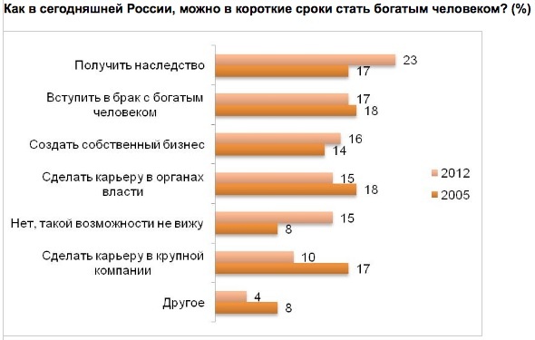 За последние семь лет значительно снизилось число тех, кто верит в возможность обогатиться за счет карьеры в крупной компании (с 17% до 10% соответственно), а также тех, кто верит в быстрое обогащение на госслужбе (с 18% до 15%). Немного больше стало тех, кто верит в финансовый успех своего бизнеса (с 14% до 16% соответственно). Зато число россиян, которые вообще не верят в возможность быстрого обогащения, выросло вдвое: если в 2005 г. таковых было 8%, то в 2012-м - 15%.