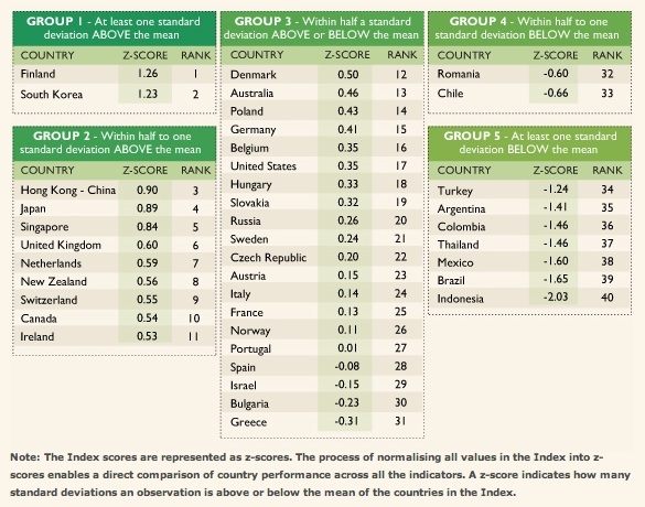 В итоговом рейтинге по уровню образованности граждан Россия находится на 20-м месте и опережает такие страны, как Швеция (21-е место), Австрия (23-е место), Италия, Франция и Норвегия (24-26 места соответственно). Превосходят Россию такие страны, как США (17-е место), Германия (15-е), Британия (6-е) и Китай (3-е). На вершине рейтинга оказались Финляндия и Южная Корея - 1-е и 2-е места соответственно. В конце рейтинга - Мексика, Бразилия и Индонезия (38-40 места соответственно).