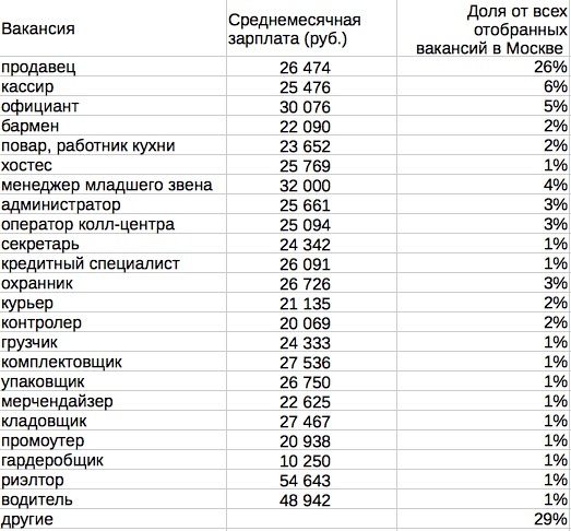 В число распространенных вакансий также попали менеджеры низшего звена со средней зарплатой около 32 000 руб., операторы колл-центров (25 000 руб.), охранники (27 000 руб.), администраторы (25 000 руб.) и курьеры (21 000 руб.).