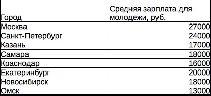 Средняя зарплата студентов в крупных городах России ("Яндекс. Работа")