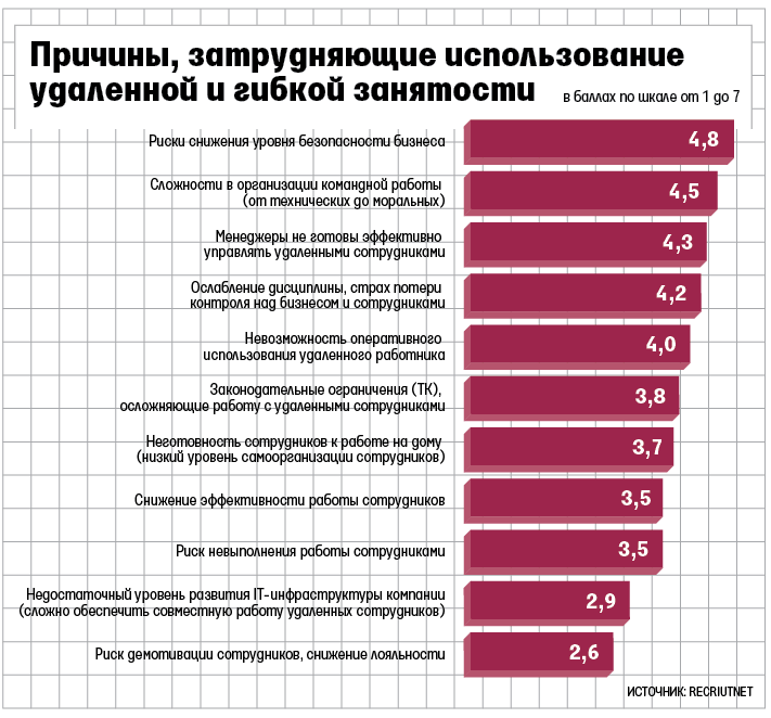 Руководителям нравится идея удаленной и гибкой занятости, но внедрять ее у себя они пока не готовы. Они не умеют управлять сотрудниками издалека, боятся ослабления дисциплины и рисков, связанных с безопасностью бизнеса