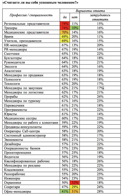 Чаще всего не считают себя успешными охранники (32%), офис-менеджеры и секретари (29%). Подробнее смотрите таблицу.