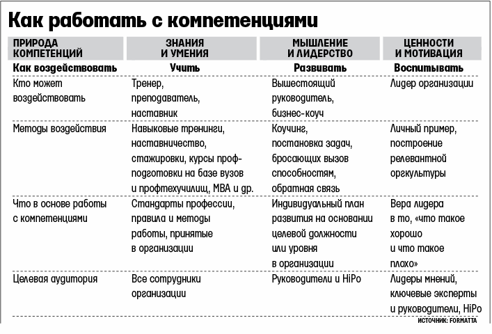 3. В основе компетенций, которые можно только воспитывать, лежат ценности и мотивация: командность, ответственность, гибкость, клиентоориентированность и т. д. Этим вещам нельзя обучить, их бессмысленно развивать, но их можно прививать. Правда, наиболее эффективно это получается делать в раннем детстве. Воспитание (а правильнее сказать, перевоспитание) взрослых людей – занятие неблагодарное. К счастью, в этой жизни мы не можем выбирать только родителей и детей, к сотрудникам это не относится. Поэтому мы в Formatta рекомендуем использовать эти компетенции в первую очередь как критерии отбора: оценивайте их на входе и выбирайте тех, кто не нуждается в «перевоспитании», по крайней мере, если речь идет о кандидатах на ключевые позиции.