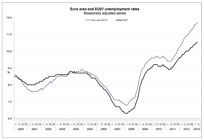 Самый высокий уровень безработицы ЕС по-прежнему в Испании (26,8%) и Греции (27%), причем именно в Греции наблюдался самый высокий взлет годового показателя в Европе (21,9% в 2012 г.). Чуть более скромная динамика роста была на Кипре (с 11,2% до 15,6%), в Испании (с 24,4% до 26,8%) и Португалии (с 15,4% до 17,8%).