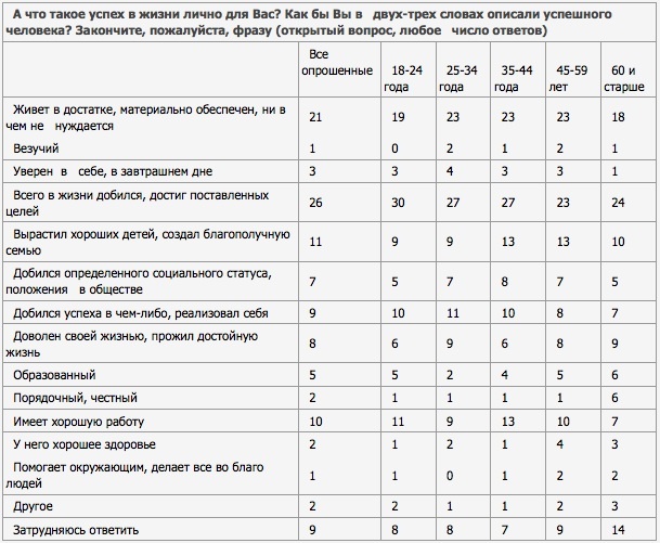 Чаще всего россияне считают успешными тех, кто сумел добиться в жизни поставленных целей, по крайней мере, так ответил каждый четвертый (26%) респондент Всероссийского центра изучения общественного мнения (ВЦИОМ). Всего в этом году было опрошено 1600 человек в 130 населенных пунктах в 42 областях, краях и республиках России.