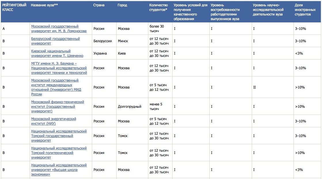 В число вузов, получивших более низкий класс ("очень высокий уровень"), вошли лишь четыре нероссийских вуза - Белорусский государственный университет, Киевский национальный университет имени Т. Шевченко, Национальный технический университет «Харьковский политехнический институт» и Национальный технический университет Украины «Киевский политехнический институт».