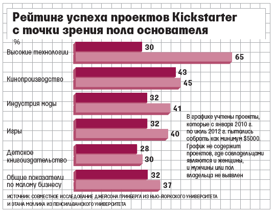 Женщины составляют 44% от общего количества спонсоров проектов на Kickstarter, рассказывает Алисия Робб, которая провела еще одно исследование сайта Kickstarter с Орли Сейд и Дэном Мэромом из Еврейского университета в Иерусалиме. Исследователи проанализировали 14 000 проектов, размещенных на сайте с апреля 2009 г. по март 2012 г. Робб обнаружила, что 40% проектов, поддержанных спонсорами-женщинами, были учреждены представительницами слабого пола. Женщины обычно просят меньше денег, чем мужчины, и это тоже способствует их успеху, замечает Робб.