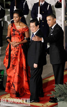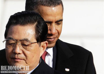 Председатель Китайской Народной Республики Ху Цзиньтао и президент США Барак Обама во время первого с 1997 г. госвизита китайского лидера в США.
