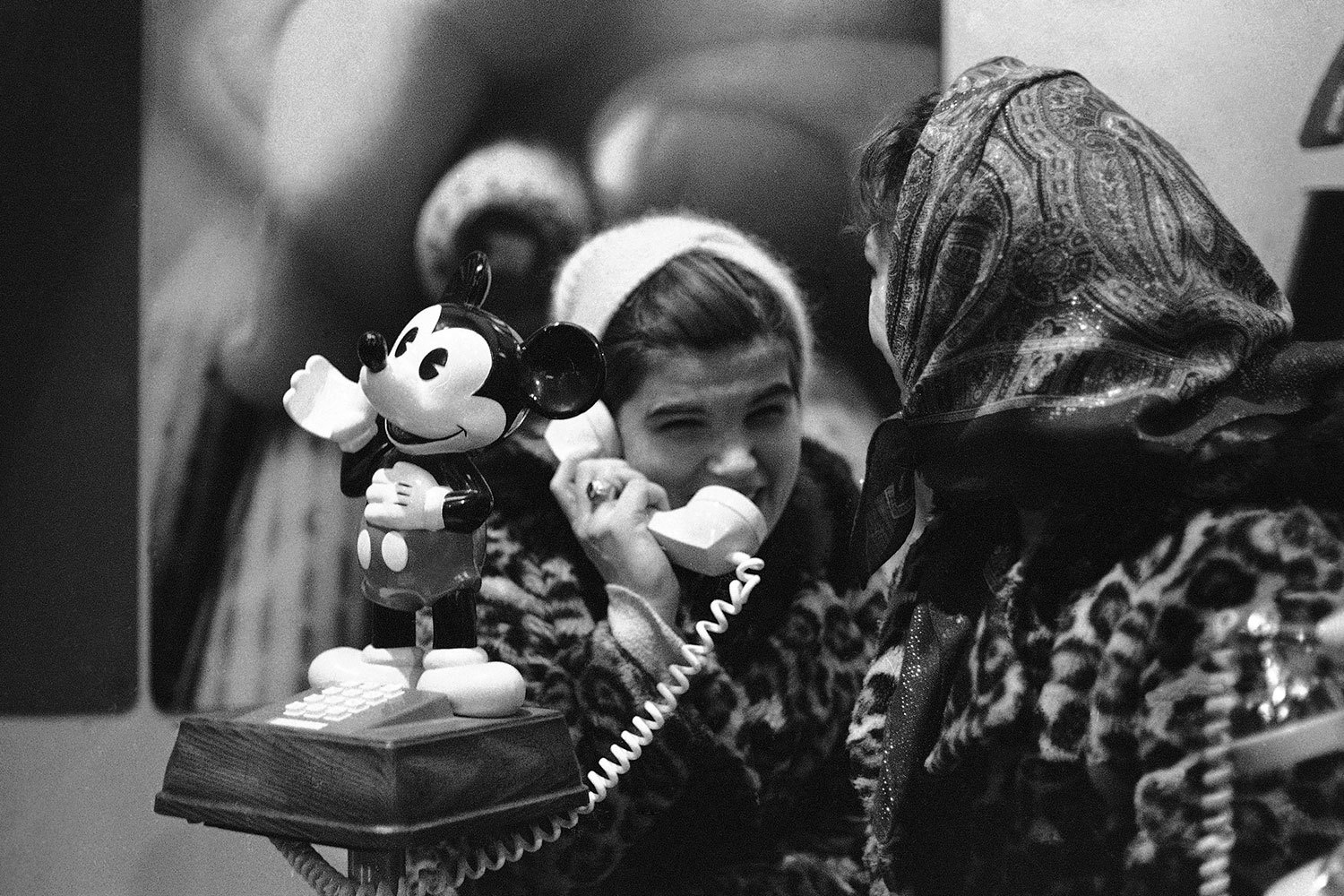 Русская девушка с телефоном в виде Микки Мауса на выставке «200 лет назад» в Москве 10 декабря 1976 г.