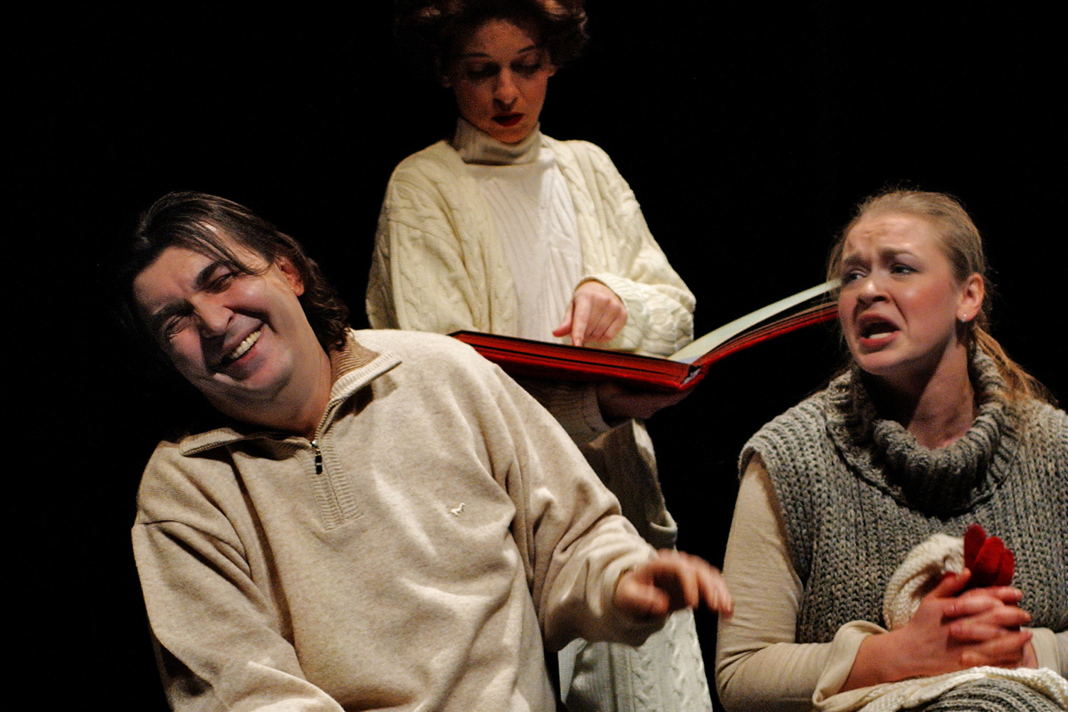 На фото слева направо: актеры Игорь Золотовицкий, Елена Лемешко и Светлана Колпакова в спектакле Марины Брусникиной «Река с быстрым течением», поставленном в МХТ, 2006 г.