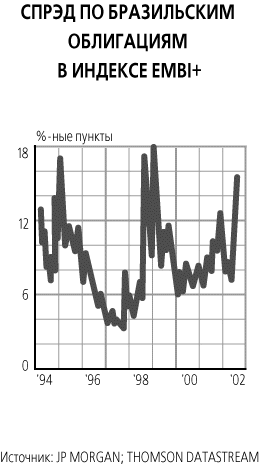Весной Бразилию чуть ли не на руках носили и хвалили - наряду с Мексикой и Чили - за то, что ее финансовое и экономическое положение столь разительно отличается от ситуации в Аргентине. Бразильские C-bonds в апреле торговались со спрэдом 7 процентных пунктов к казначейским облигациям США, и инвестбанки расхватывали их как горячие пирожки. В пятницу бразильские бонды стали вторым по уровню риска объектом для инвестиций в развивающихся странах: спрэд вырос до 17 пунктов. Хуже этих бумаг сегодня только облигации неплатежеспособной Аргентины. Вместе с бразильскими обвалились евробонды России, Филиппин, Мексики.