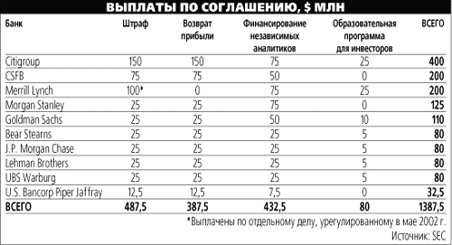 В итоге 10 банков выплатят $1,388 млрд в виде штрафа, возврата прибыли, полученной за счет незаконных действий (половина средств по этим двум статьям пойдет в фонд возмещения потерь клиентам банков), отчислений на финансирование независимых аналитических фирм и образовательной программы для инвесторов (см. таблицу).