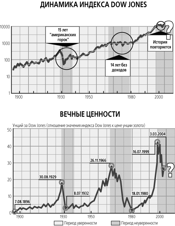 Нельзя не обратить внимания и на магию чисел: кризис, надолго отправляющий инвесторов в нокдаун, происходит вокруг круглых отметок индекса DJ: в 1929 г. - начале 30-х гг. турбулентные потоки закрутили индекс вокруг отметки 100 пунктов, в конце 60-х - 1000 пунктов, в конце 1990-х - начале 2000-х - 10 000 пунктов (см. график).