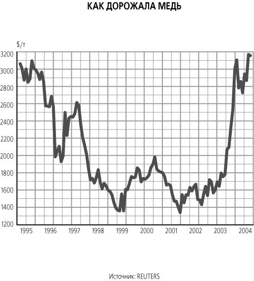При этом аналитики не ожидают падения мировых цен на медь в ближайшем будущем. Матвеев из Альфа-банка считает, что в среднем по 2004 г. цена на медь составит $2750 за 1 т, что на 50% больше уровня прошлого года. “Пока на рынке дефицит меди, а увеличение ее производства не прогнозируется, цены будут сохраняться на нынешнем уровне”, – говорит он. А Скотт Сэмет из МДМ-банка напоминает, что в 90-х гг. цены на медь резко упали из-за наращивания производства основными странами-экспортерами – Чили и США. “Если дефицит на рынке будет сохраняться, эти страны могут вновь ввести в строй простаивающие сейчас мощности”, – предполагает он. По его информации, американская Phelps Dodge планирует в этом году увеличить производство на 11%, а в 2007 г. – на 17%. В то же время растущее потребление со стороны Китая сохранит цены на нынешнем уровне, прогнозирует Сэмет.