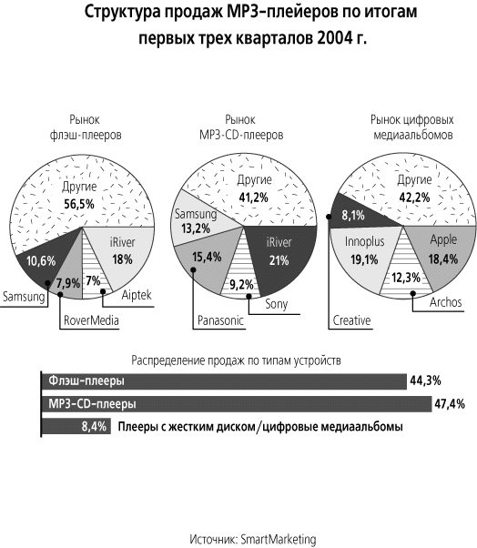 По оценке ведущего эксперта аналитической компании SmartMarketing Игнатия Киппельмана, годовой оборот российского рынка MP3-плейеров составляет около $35 млн. Эти цифры включают продажи не только цифровых медиаальбомов (средняя цена $370), но и flash-плейеров (средняя цена – $130) и MP3-CD-плейеров ($93).