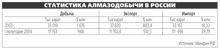 Как рассказал “Ведомостям” источник в Минфине, в денежном выражении в 2003 г. объем добычи составил около $1,7 млрд. Из России в прошлом году экспортировано 37,8 млн карат алмазов на $883,4 млн, а импортировано – 33 163 карат на 18,3 млн. Тот факт, что вывезено из России алмазов больше, чем добыто, собеседник “Ведомостей” объясняет тем, что “АЛРОСА” могла продавать переходящие остатки прошлых лет, а “Алмазювелирэкспорт” – камни из запасов Гохрана.