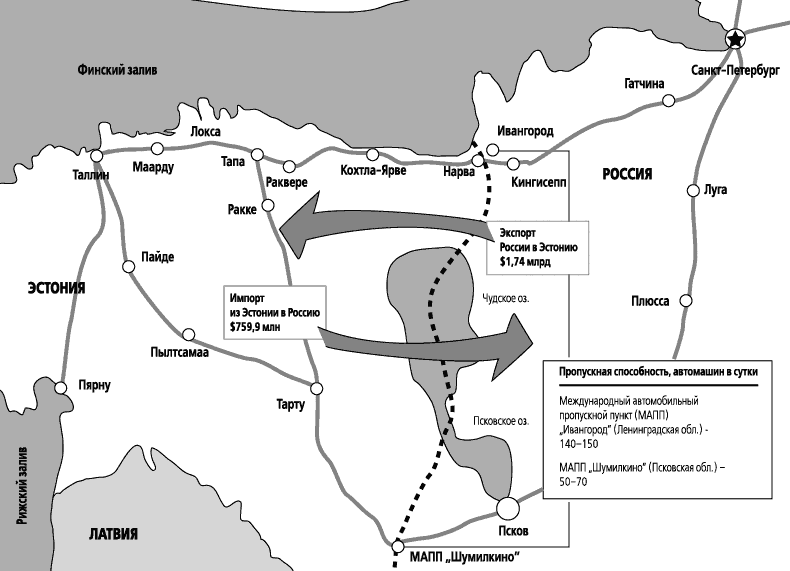 Половина российско-эстонской границы проходит по Чудскому озеру, а автомобильное сообщение возможно лишь через проходящую вдоль побережья Финского залива дорогу на северо-востоке Эстонии (пропускной пункт “Ивангород”) и через Печорский район Псковской области на юге (пункт “Шумилкино”). Путь из Таллина до Ивангорода вдоль Финского залива – чуть более 200 км, а в обход через “Шумилкино” – в 2,5 раза длиннее.