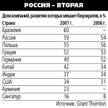 Чаще всего на бюрократию жалуются в Бразилии, России и Польше, а меньше всего – в Сингапуре, Испании и Швеции (см. табл.). Эксперты Grant Thornton опросили 7200 предпринимателей из 32 стран (в России – руководителей 250 компаний из 11 крупных городов). Год назад лидеры были те же (Бразилия не участвовала), но доля недовольных чиновниками в Греции, Польше и Германии уменьшилась, а в России выросла на пять пунктов. Список проблем российских и мировых компаний бюрократы возглавляют в опросе GT пять лет подряд.