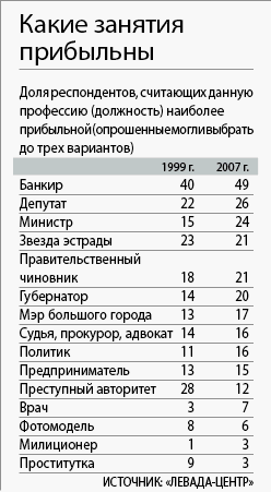 Вопрос о доходности профессий социологи задали во второй раз, впервые с 1999 г. Список самых доходных профессий снова возглавили банкиры. Богаче, по мнению россиян, стали чиновники, депутаты, врачи. Потеряли в деньгах «авторитеты», артисты, фотомодели.