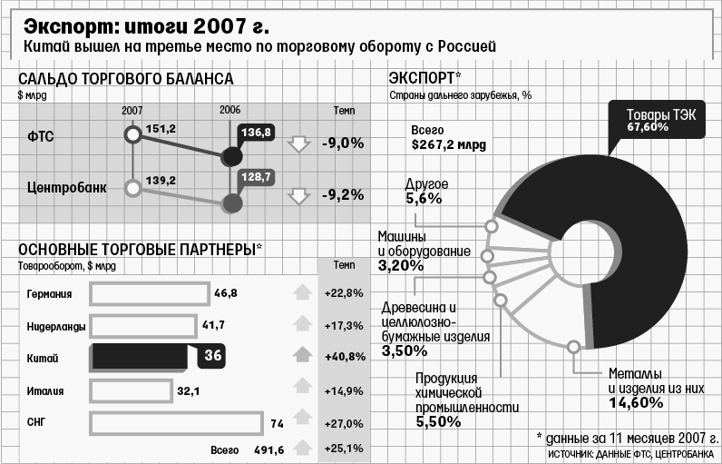 Доля ЕС во внешнеторговом обороте России сократилась с 54,8% до 51,5%, доля СНГ выросла с 14,8% до 15%. Товарооборот с Китаем вырос на 40,8%, он вышел на третье место среди экономических партнеров России (см. график).
