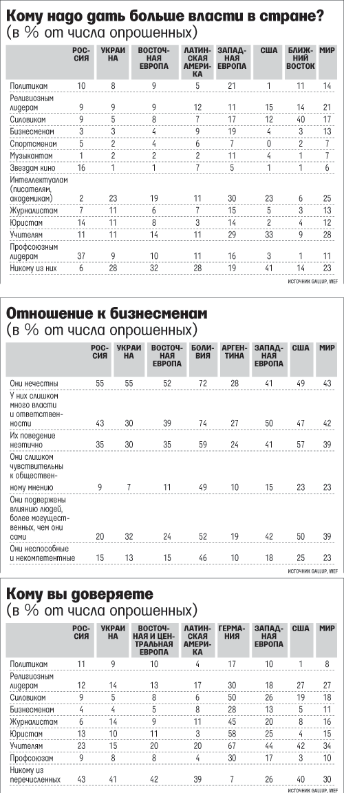 Уровень доверия к бизнесменам и журналистам в России – намного ниже среднемирового. Бизнес-лидерам доверяют лишь 4% россиян, журналистам – 6% (во всех 60 странах – 11% и 16% соответственно).