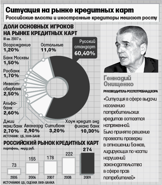 Лидерство на этом рынке по-прежнему сохраняет «Русский стандарт» с долей 60,4%; в 2006 г. конкуренты оценивали его долю в 67%. За ним следуют ХКФ-банк с долей 10,3%, Ситибанк – 3,2% и банк «Авангард» – 2,9%.
