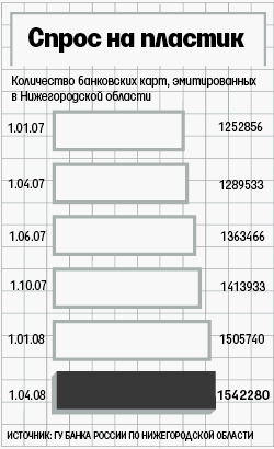 Но банкиры оптимистичны. По платежным картам нижегородского НБД-банка в 2007 г. количество операций в области по сравнению с 2006 г. увеличилось на 30%, проводимые суммы – на 93%, количество карт – на 60,5%. По итогам I квартала 2008 г. было проведено 63 518 операций на сумму 367 млн руб. На 1 апреля 2008 г. количество карт уже составило 13 595 шт. По словам начальника отдела электронных платежей НБД-банка Сергея Мешалкина, пластиковые карты – вспомогательный продукт по отношению к основному направлению деятельности банка: кредитованию малого и среднего бизнеса. Банк ожидает роста числа выданных карт с ростом количества клиентов.