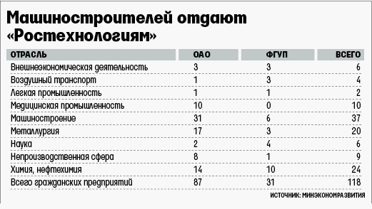 Минэкономразвития не против и передачи «Ростехнологиям» пакетов акций гражданских предприятий (см. таблицу) кроме находящихся в процессе банкротства и ликвидации (ОАО «Тяжмаш» и ОАО «Химреактив»). Также министр Эльвира Набиуллина предлагает исключить из списка пакеты акций АО размером меньше блокирующего.