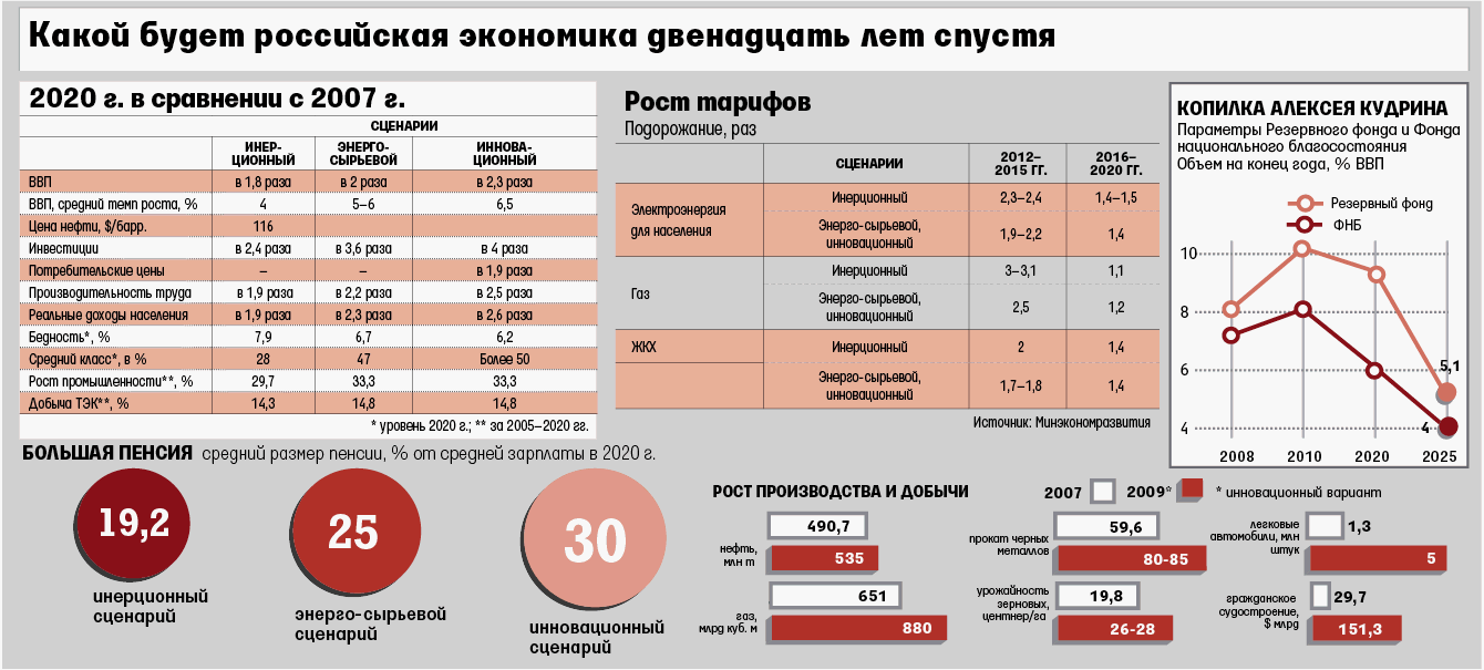 Образцовый, инновационный, сценарий развития по ряду показателей повторяет предыдущий вариант. Его преимущества проявятся после 2015–2018 гг., когда, в отличие от нефтяной траектории, экономика не замедлит темп роста. Объем инвестиций в двух последних сценариях примерно одинаков, но в инновационном варианте они поступают и в ТЭК, и в модернизацию высокотехнологичных отраслей. Государство и бизнес больше, чем в энергосырьевом сценарии, инвестируют в НИОКР, здравоохранение, образование. Каждый второй взрослый россиянин в 2020 г. будет с высшим образованием.