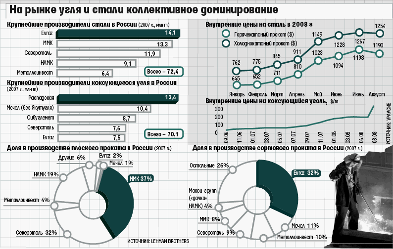 Цены на коксующийся уголь с начала года в России выросли на 60%. По некоторым контрактам «Мечела» в первом полугодии он стоил 5000 руб. за 1 т, утверждает источник в ФАС (представитель «Мечела» это не комментирует). Правда, «Распадская» и Evraz сообщали о более низких ценах в первом полугодии 2008 г.: $144 за 1 т и $149 за 1 т соответственно. Цены на сталь тоже на максимуме: горячекатаный прокат с начала года подорожал на 84%, холоднокатаный – на 64,6% (см. инфографику).
