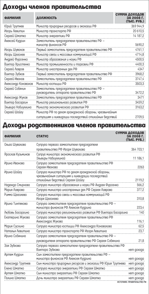 Тройка лидеров по доходам – отраслевые министры: природных ресурсов Юрий Трутнев, министр транспорта Игорь Левитин и министр энергетики Сергей Шматко. Самым богатым членом правительства, как и прежде, остался Трутнев. В прошлом году он получил почти 370 млн руб. Два года назад его доход был гораздо скромнее – около 133,6 млн руб. Когда Трутнев пришел на госслужбу в 2004 г., он продал в рассрочку пакет акций группы компаний «Экс» (занимается торговлей, транспортом и строительством), напоминает представитель Минприроды: два года назад сделка была закрыта и средства были переданы в управление. 370 млн руб. – это не реальный доход министра, уточняет он, а оборотные средства. Реальный доход – более 100 млн руб., включая зарплату – около 120 000 руб. в месяц, говорит представитель Минприроды.